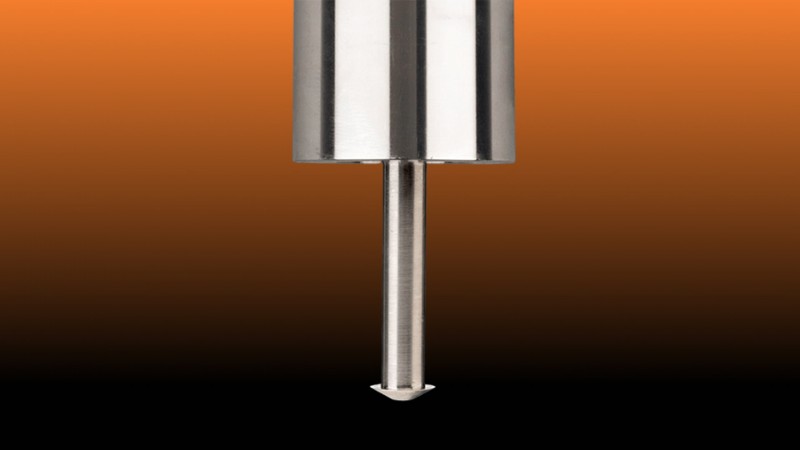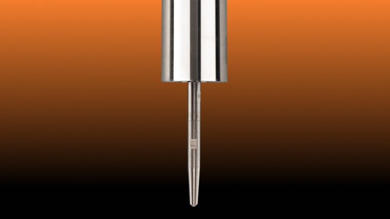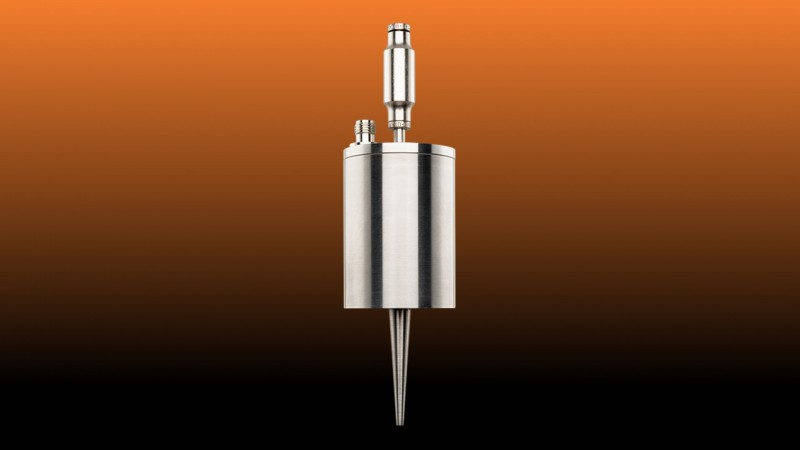 With the radial atomizer nozzle sprays come from the side of the nozzle tip. The nozzle has a small inner tube within the probe tip which leads out to small diameter holes along the side. Liquids exiting the small holes are sprayed towards the outside. This nozzle is useful for sprays that have to deposit along the inside wall of a tube and cannot fall to the bottom.